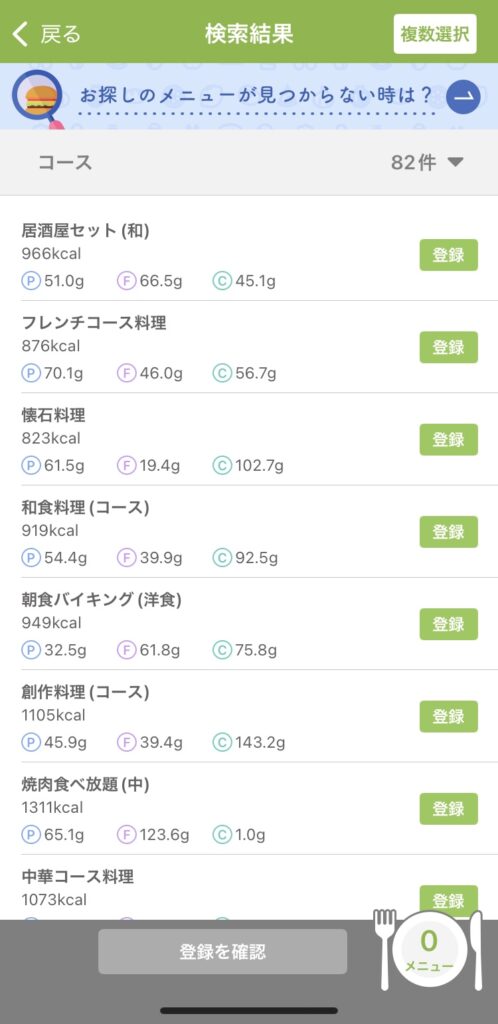 たとえば、フレンチのお店に行ったら「フレンチコース(876kcal)」を選択、和食なら「和食コース(約919kcal)」をざっくりと入力しています。